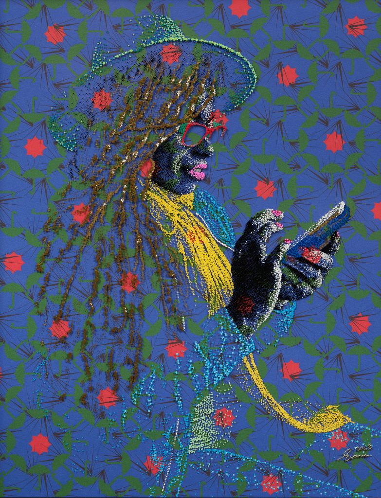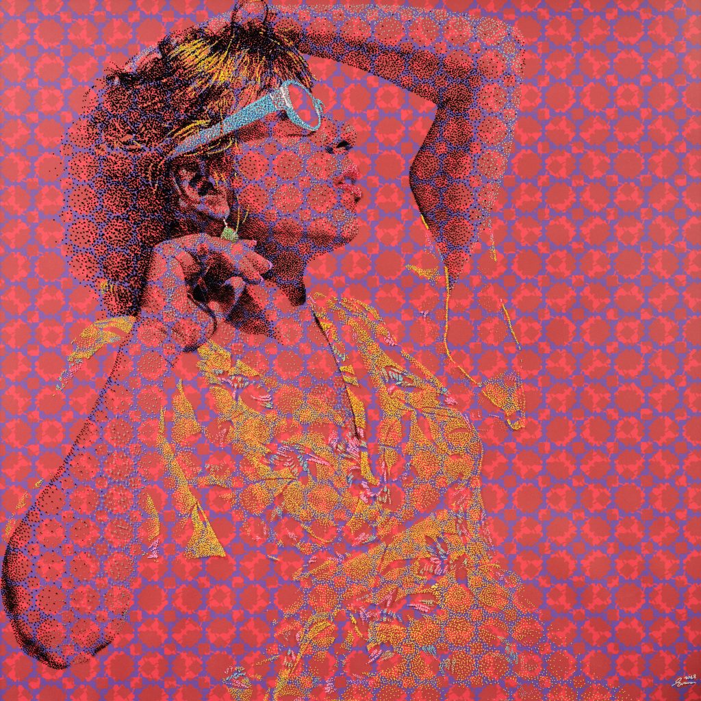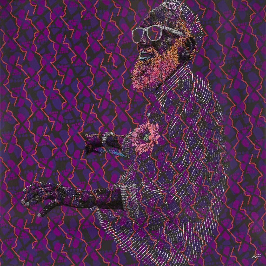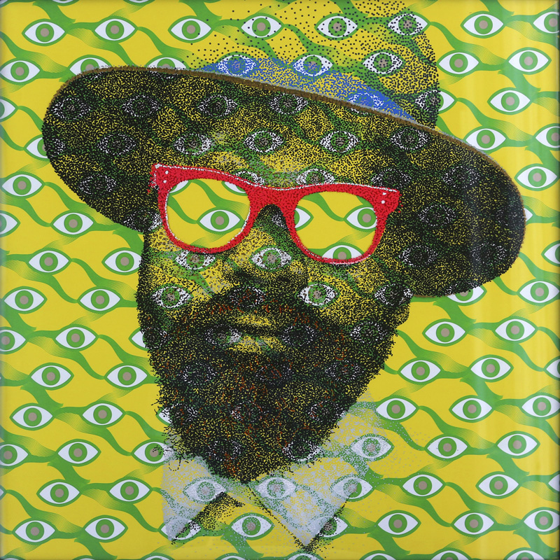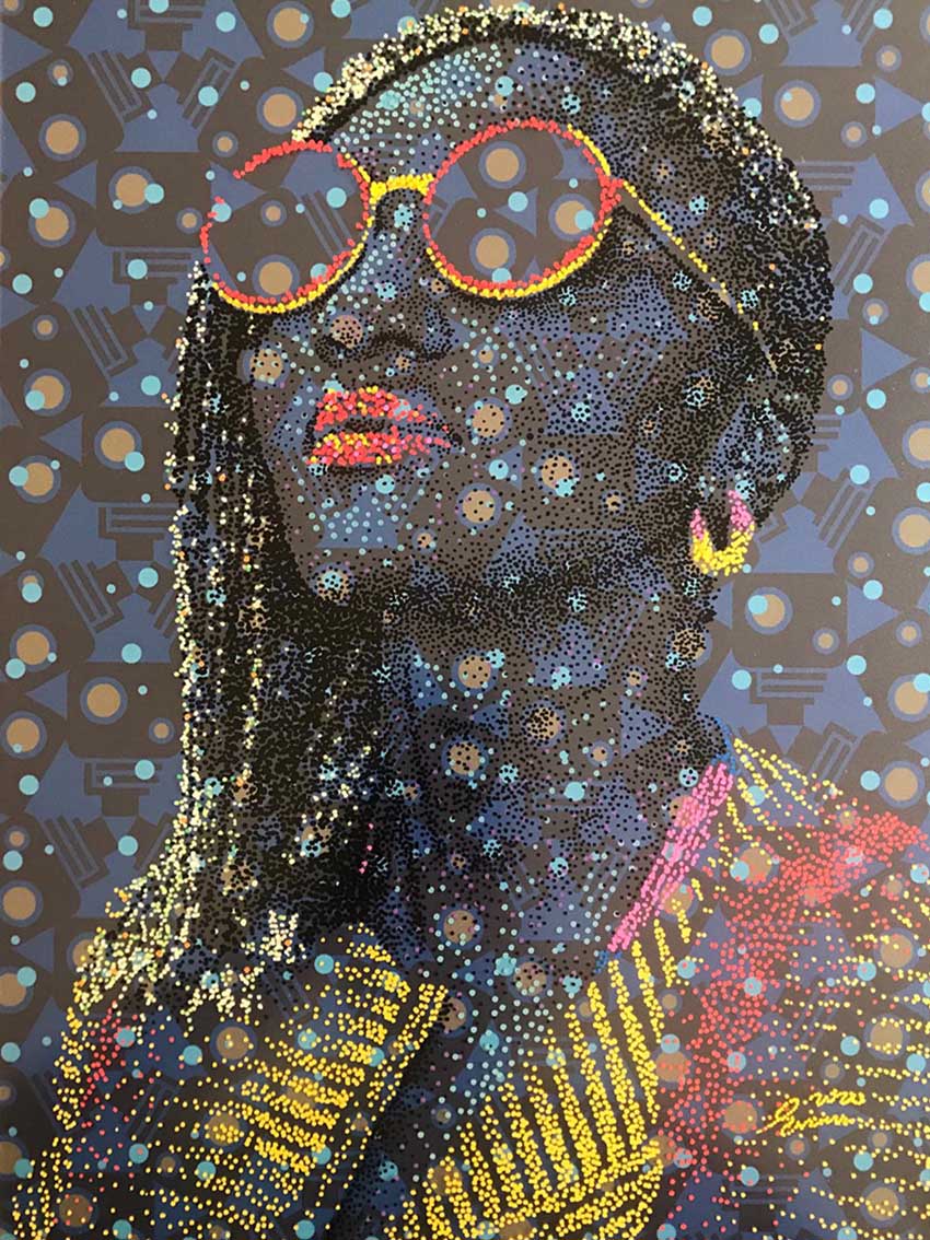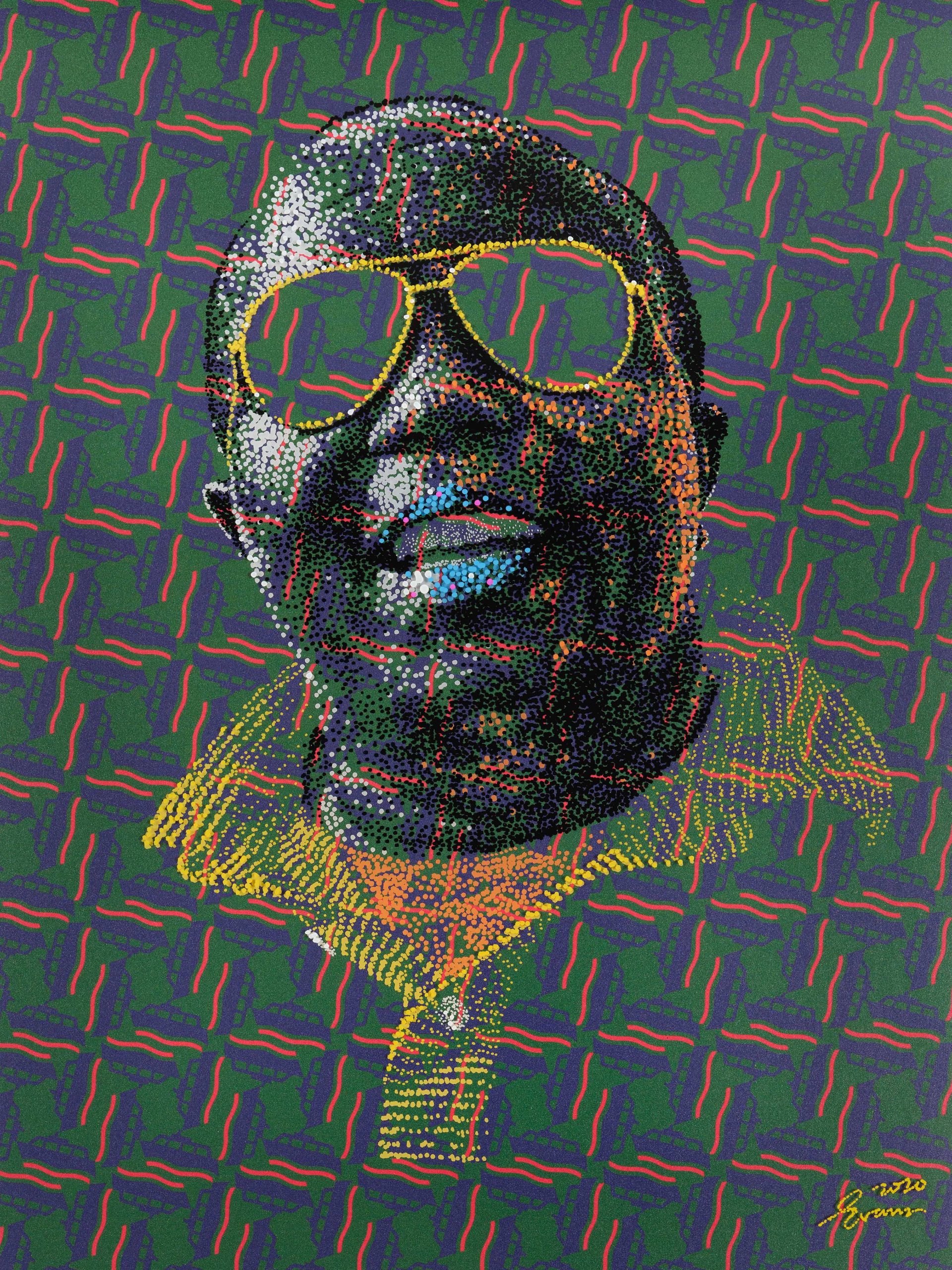 Evans layers paint on plexiglass over original prints of his patterns on paper, creating effects of transparency and depth. Light passes through these layers and animates the portraits, intensifying their presence and inviting the viewer into an almost tactile experience in which color, texture and light enter into dialogue with memory and emotion.