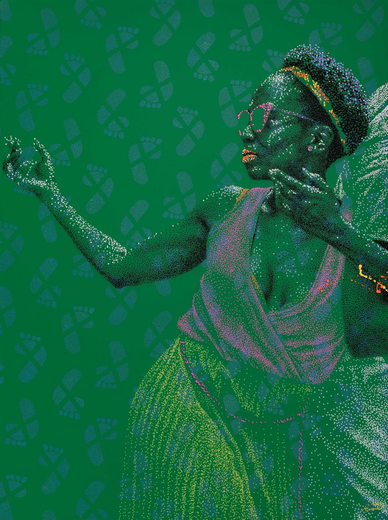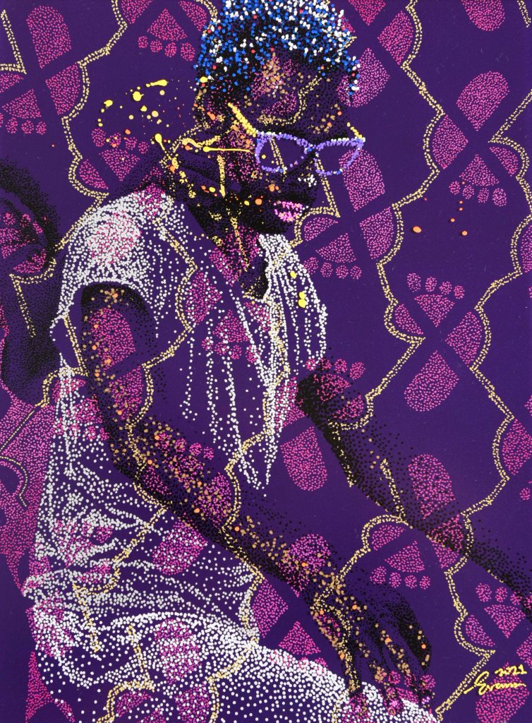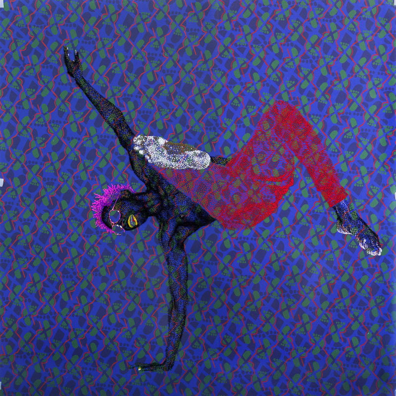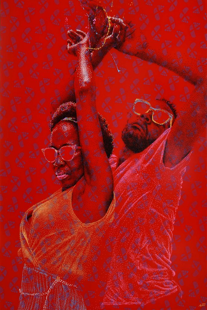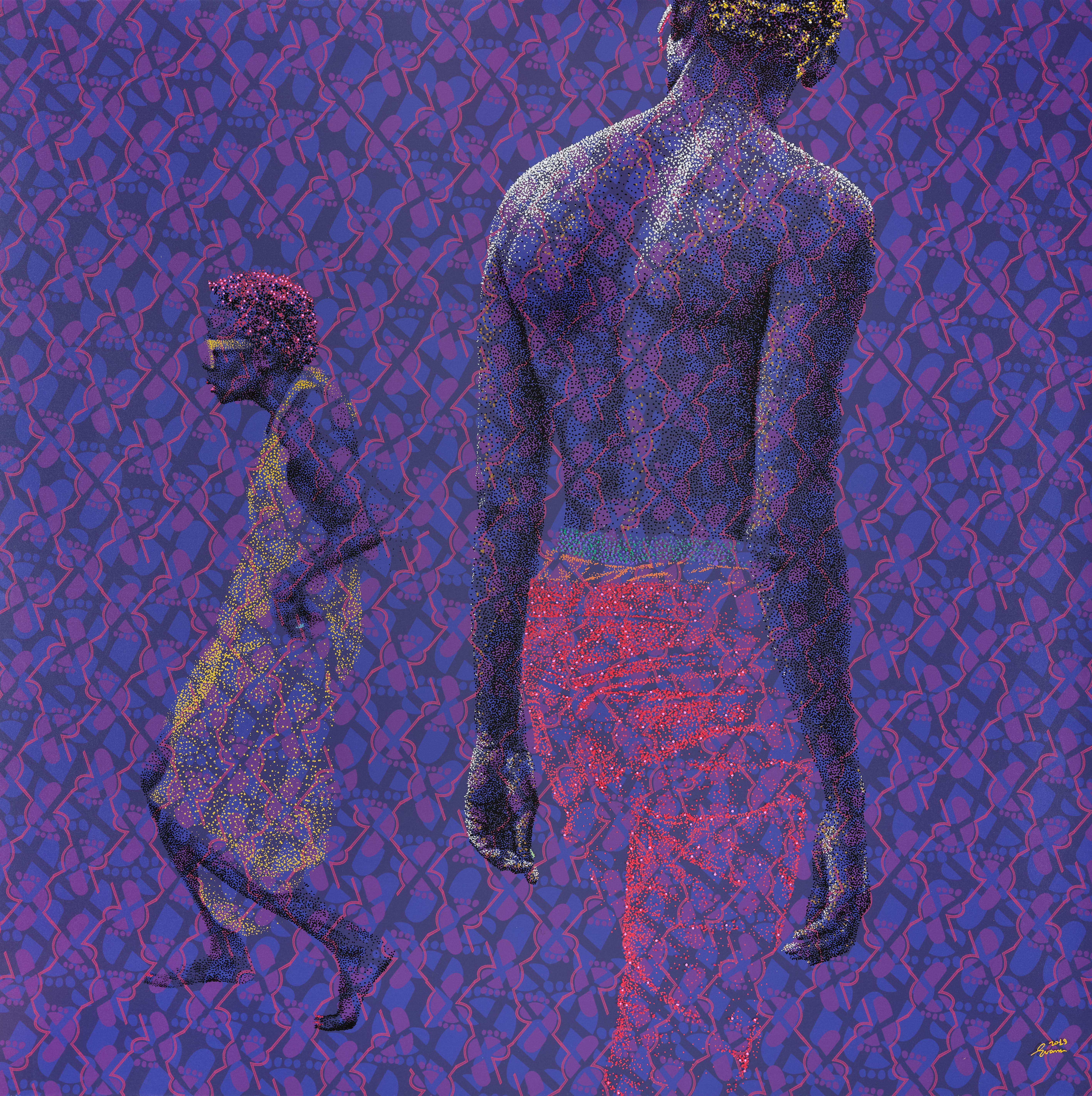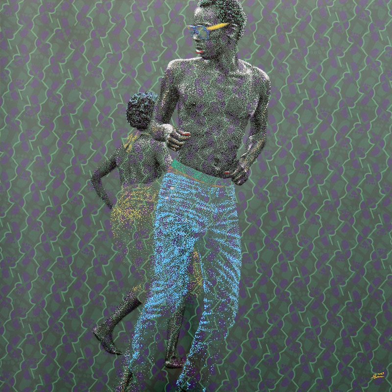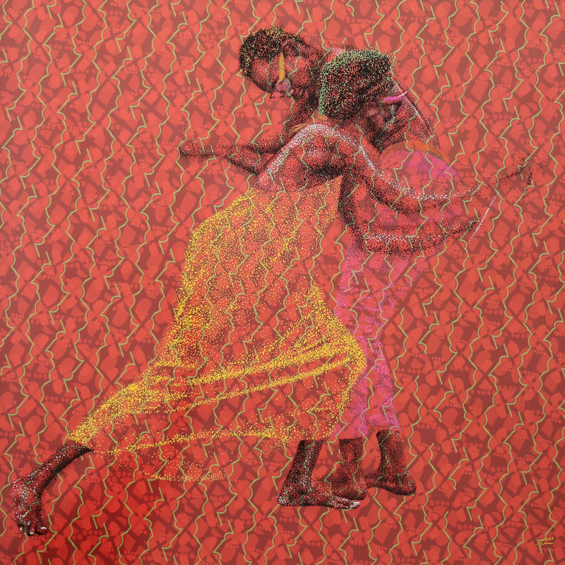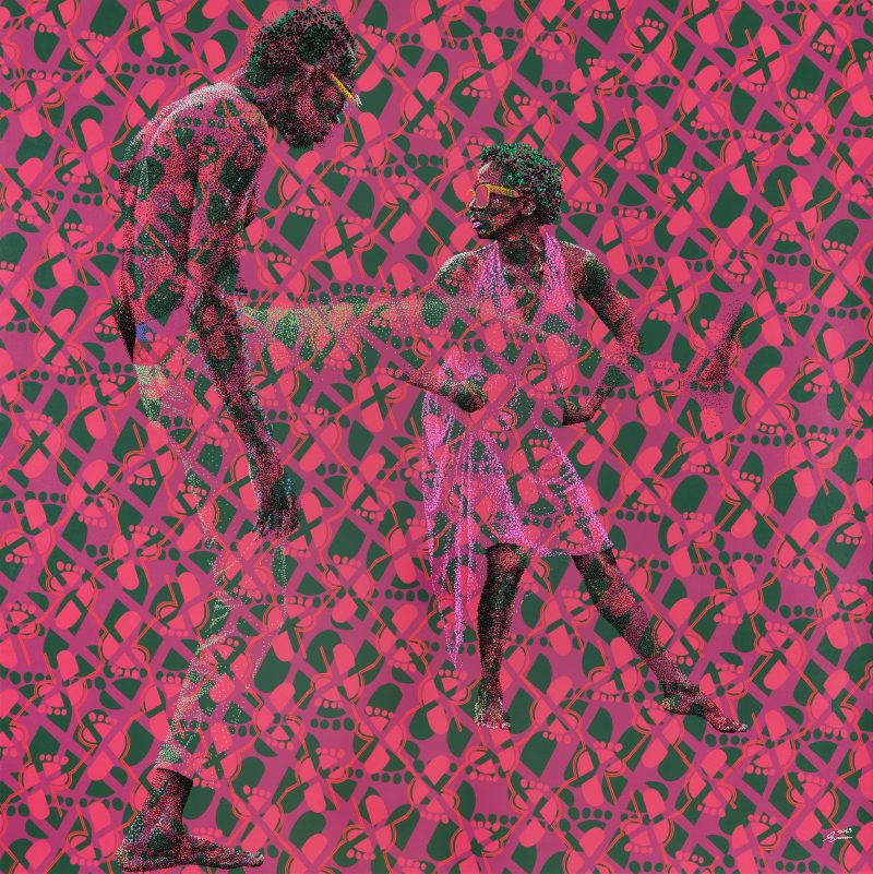 With Body Talk, he investigates the dynamic intersection between painting, dance, sound, and performance. Through this layered methodology, he explores themes of cultural hybridity, memory, and identity construction within contemporary African contexts. These dancing portraits highlight the body’s ability to carry complex stories and cultural narratives. The dancers’ movements intertwine with an original background motif composed of the pictogram of a bare foot. This symbol acts as a conceptual anchor, embodying the body as language and evoking the traces left across cultures and histories. At the core of this series unfolds an exploration of movement and presence, emphasizing the communicative power of the body beyond spoken language.