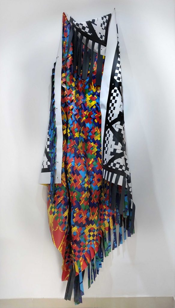 From a collection of pictograms, signs and urban symbols found in places where he lived, traveled, he revisits the patterns of textiles like khanga or batik. Evans develops a personal and symbolic visual language from communication codes loaded with local meanings. Each pictogram selected is digitally transformed into an original design and printed on paper or fabric. Two distinct patterns are cut into strips and woven by hand, interweaving the different signs into a unified abstract composition. This process has a strong metaphorical significance. Weaving becomes a visual articulation of human movement and the complexity of navigating within the social fabric. The resulting works, which he describes as imaginary abstract landscapes, unfold into texile sculptures.